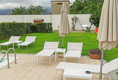 Gli spazi esterni, la piscina e il giardino creano un ambiente perfetto per rilassarsi dopo una giornata di escursioni o di mare.